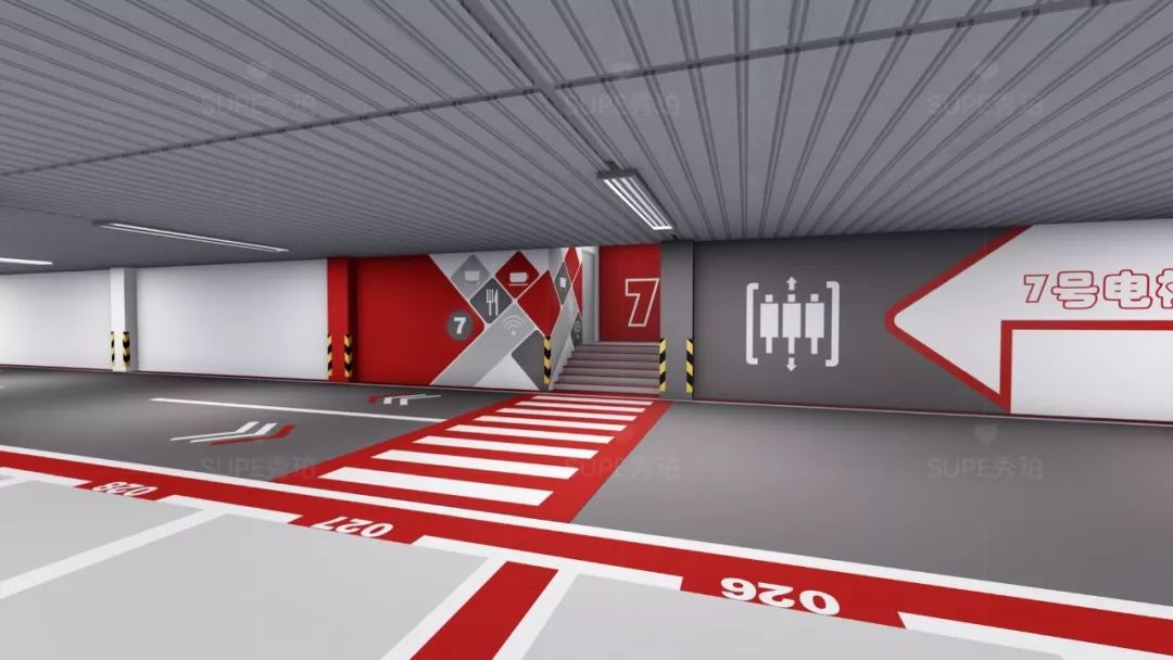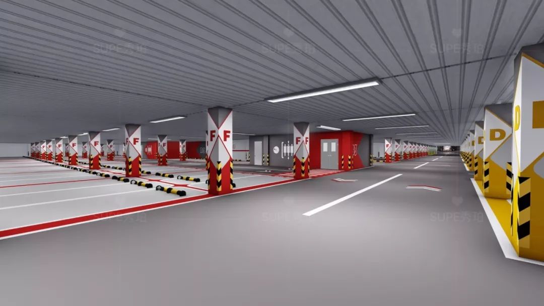 適用于商業(yè)類建筑停車場,采用活躍的中強對比的配色方式,烘托商業(yè)景象。