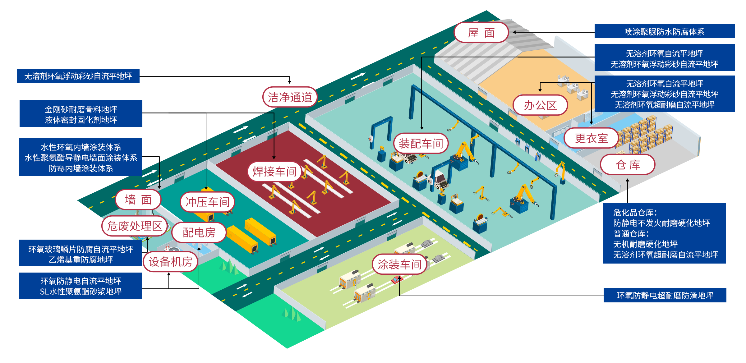 隨工業(yè)升級而來的智能制造工廠、高端裝備制造工廠,自動化程度越來越高,設備和產(chǎn)品對生產(chǎn)環(huán)境要求較好的潔凈度、工廠內物料流通要求地面的高平整度和高抗壓耐磨度,配套的涂裝車間要求防靜電。