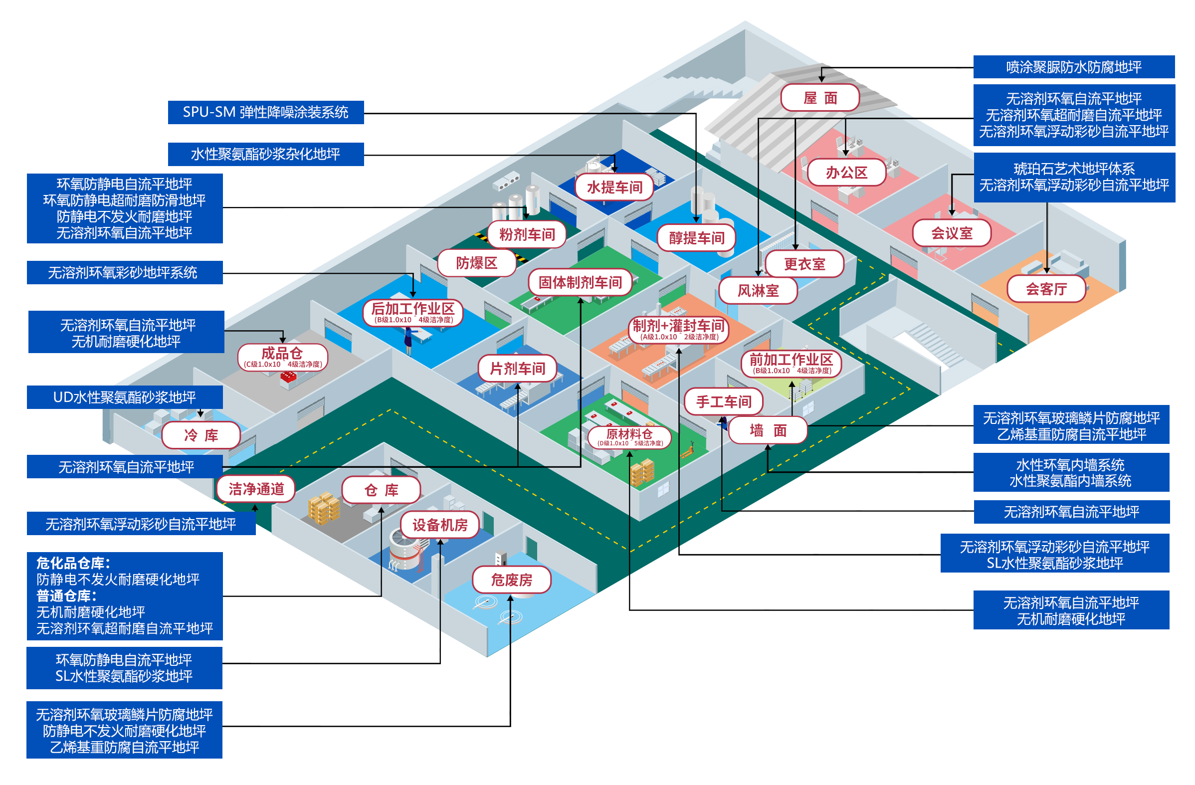 包括化學(xué)藥,中成藥,生物制藥和血液制品等細(xì)分類(lèi)目,以GMP車(chē)間標(biāo)準(zhǔn)要求,對(duì)不同類(lèi)型的車(chē)間提供不同的地面涂裝解決方案。