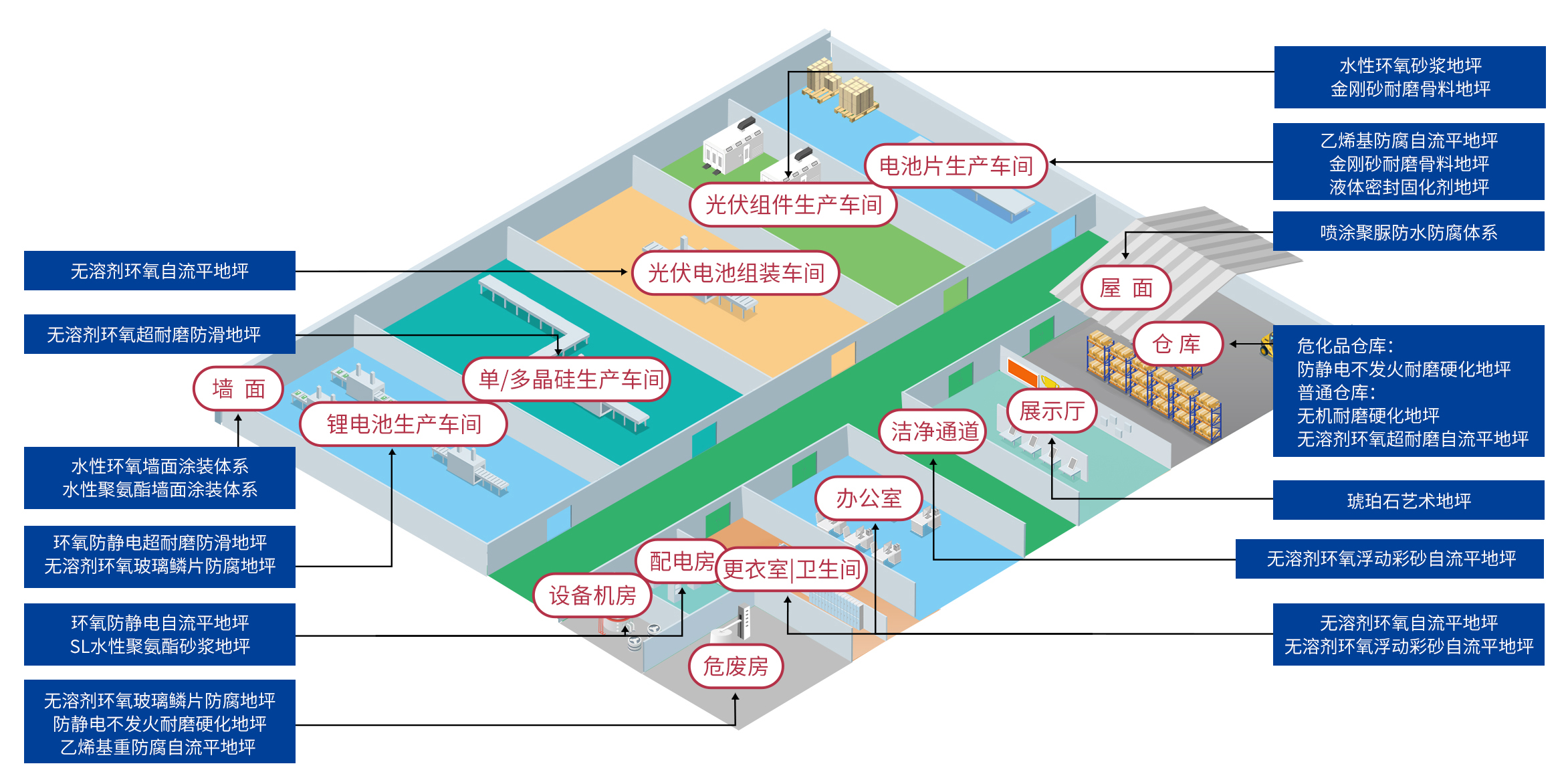 包括了光伏,鋰電等新能源產(chǎn)業(yè)。制造工廠從單\多晶硅,到太陽能面板,組件,鋰電池生產(chǎn)等。工廠對在地面的要求也不盡相同,大致可分為耐磨抗壓、防導(dǎo)靜電和防腐等主要需求
